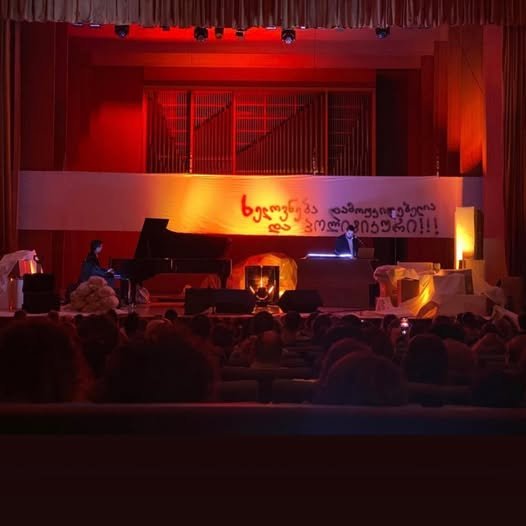 „ხელოვნება დამოუკიდებელი და პოლიტიკურია” — პერფორმანსი კონსერვატორიაში, გიორგი გიგაშვილის და Nikala-ს ერთობლივი პროექტიის „სერიოზული მუსიკის” დროს.