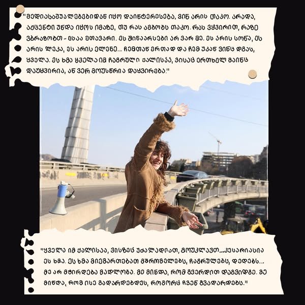 “მეტროსთან რომ მოვდივართ, შეგრძნება მაქვს, რომ მეტროში ჩადის ჩვენი ხმა, და რომ ის ხალხი, ვინც იქ მატარებელს ელოდება, შეიძლება, ისმენდეს, რომ ვყვირით – “ღირსეული პირობები მშრომელებს”, “ღირსეული პირობები დევნილებს!” ამ დროს მაქვს შეგრძნება რომ ნაცნობ პროპაგანდას ვუპირისპირებთ ნამდვილ შინაარსებს, რომლის გამოც ვდგავართ ქუჩაში, და რომელიც ყველა ჩვენგანს აერთიანებს.ავტობუსის გაჩერებებზე, სამსახურებში, სხვადასხვა ადგილებში, პროტესტის შინაარსებს ადამიანებს ვაწვდენთ. ქუჩაში ერთმანეთისთვის ვდგავართ. იმისთვის ვდგავართ, რომ გავიგოთ, რა არის უკეთესობა. ერთი ჭირიდან მეორე ჭირში გადასვლას უნდა გავეშვათ. აღარ უნდა დავუწესოთ ადამიანებს ჩარჩოები, როდის რაზე ილაპარაკონ. იმისთვის ვდგავართ, რომ ყველამ ერთად ვიპოვოთ, რას ნიშნავს ქართველობა. ამ პროტესტში ყველას ადგილია. აქ პრიორიტეტი ხალხი და მისი კეთილდღეობაა.