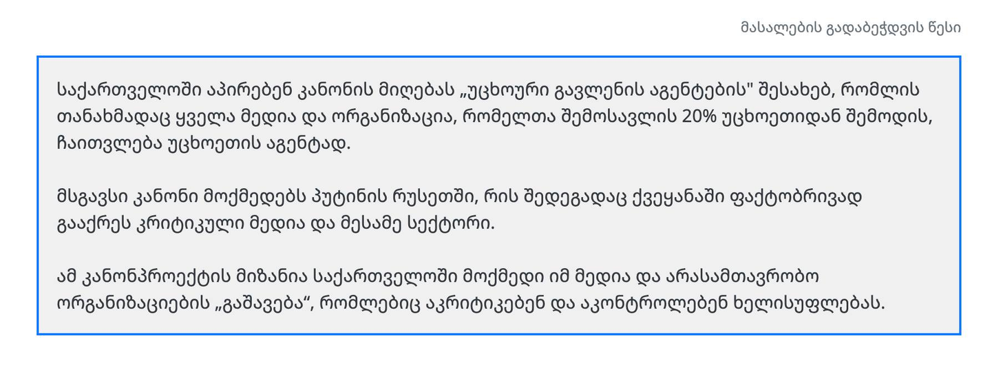 ❗ აღნიშნული კანონპროექტის მიზანია ხელისუფლებისამდი კრიტიკულად განწყობილი მედიისა და არასამათავრობო სექტორის გაქრობა, რაც გამოიწვევს თავისუფალი სიტყვისა და აზრის გამოხატვის შეუძლებლობას.