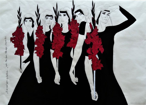 თინა ცხადაძე და მისი ნამუშევრები სერიიდან Georgian Dark (ქართული მუქი)
